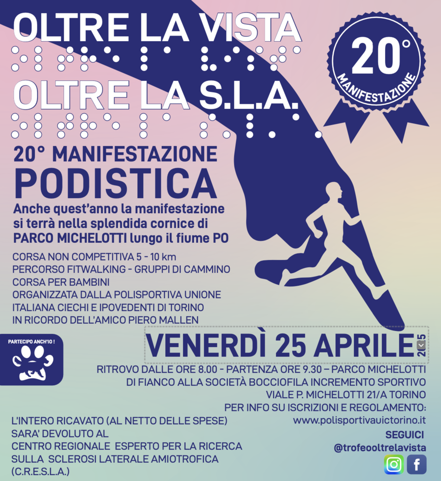 Venerdì 25 aprile 2025, presso il Parco Michelotti di Torino, si terrà la ventesima edizione di "Oltre la vista... Oltre la SLA", una manifestazione podistica a scopo benefico organizzata dall'A.S.D. Polisportiva UICI Torino.