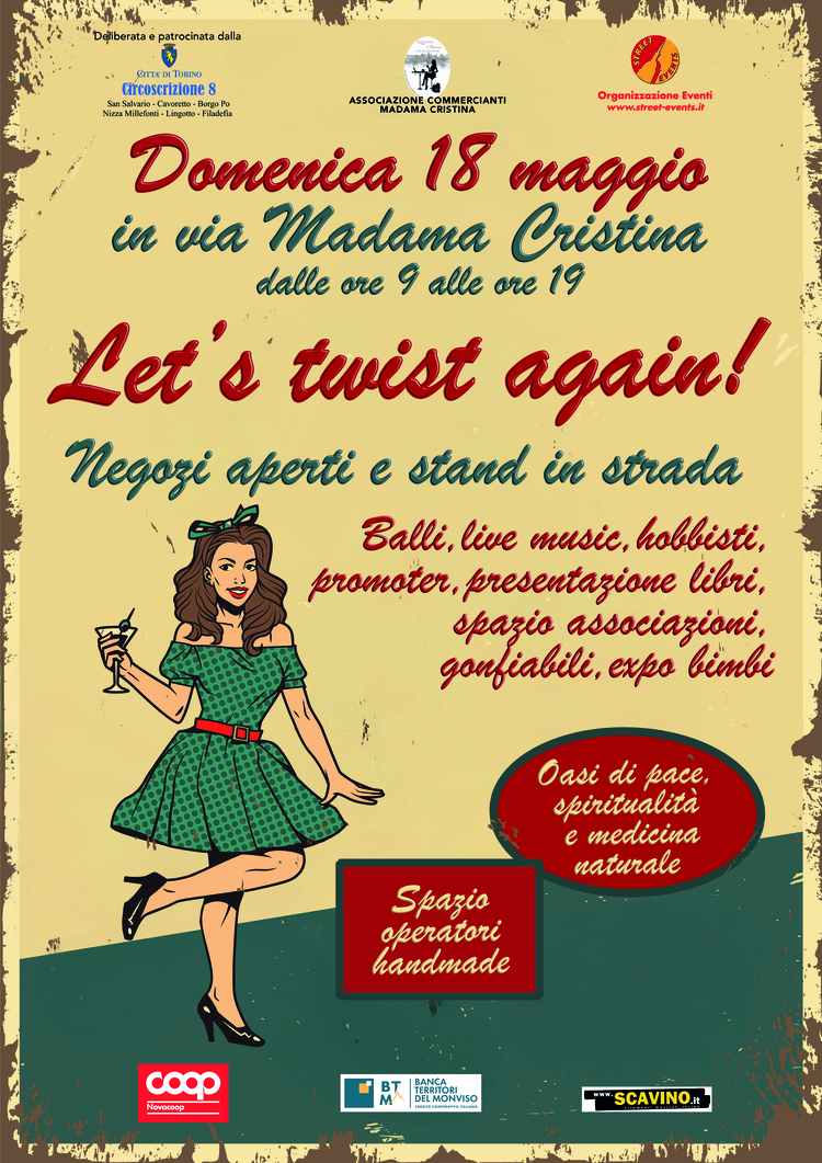 Domenica 18 maggio dalle 09:00 alle 19:00 in via Madama Cristina si terrą la festa Let's twist again! Un'intera giornata con balli, live music, dallo spirito anni Sessanta e Settanta. Alle attivitą commerciali in sede fissa si aggiungeranno bancarelle con eccellenze agroalimentari del territorio.Nel corso della giornata diversi hobbisti e artigiani esporranno i loro lavori e saranno presentati anche dei libri.