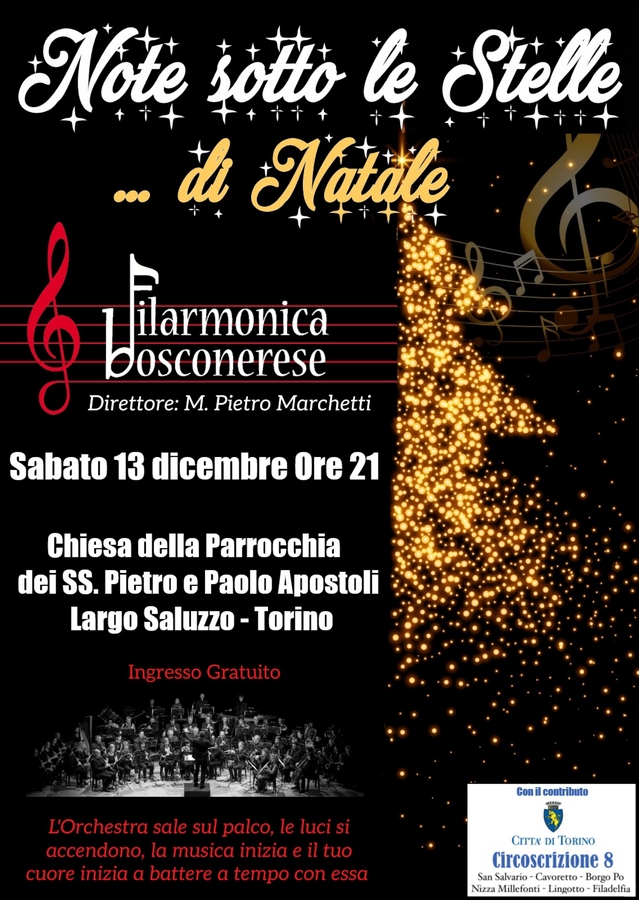 Note sotto le Stelle di Natale č un concerto aperto a tutti, diretto da M. Pietro Marchetti. L'Orchestra sale sul palco, le luci si accendono, la musica inizia e il tuo cuore inizia a battere a tempo con essa.L'evento si terrā il 13 dicembre alle 21:00, presso la Chiesa dei SS. Pietro e Paolo, in Largo Saluzzo, Torino.
