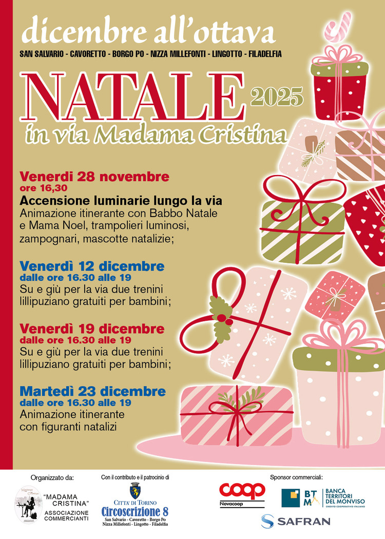 NATALE 2025 in via Madama Cristina è un programma di iniziative natalizie con animazioni, accensione delle luminarie, spettacoli e attività gratuite per la cittadinanza, pensate per vivere insieme l'atmosfera delle feste lungo la via.